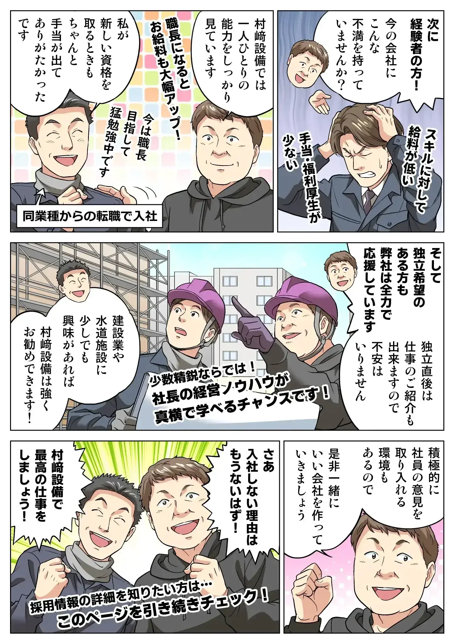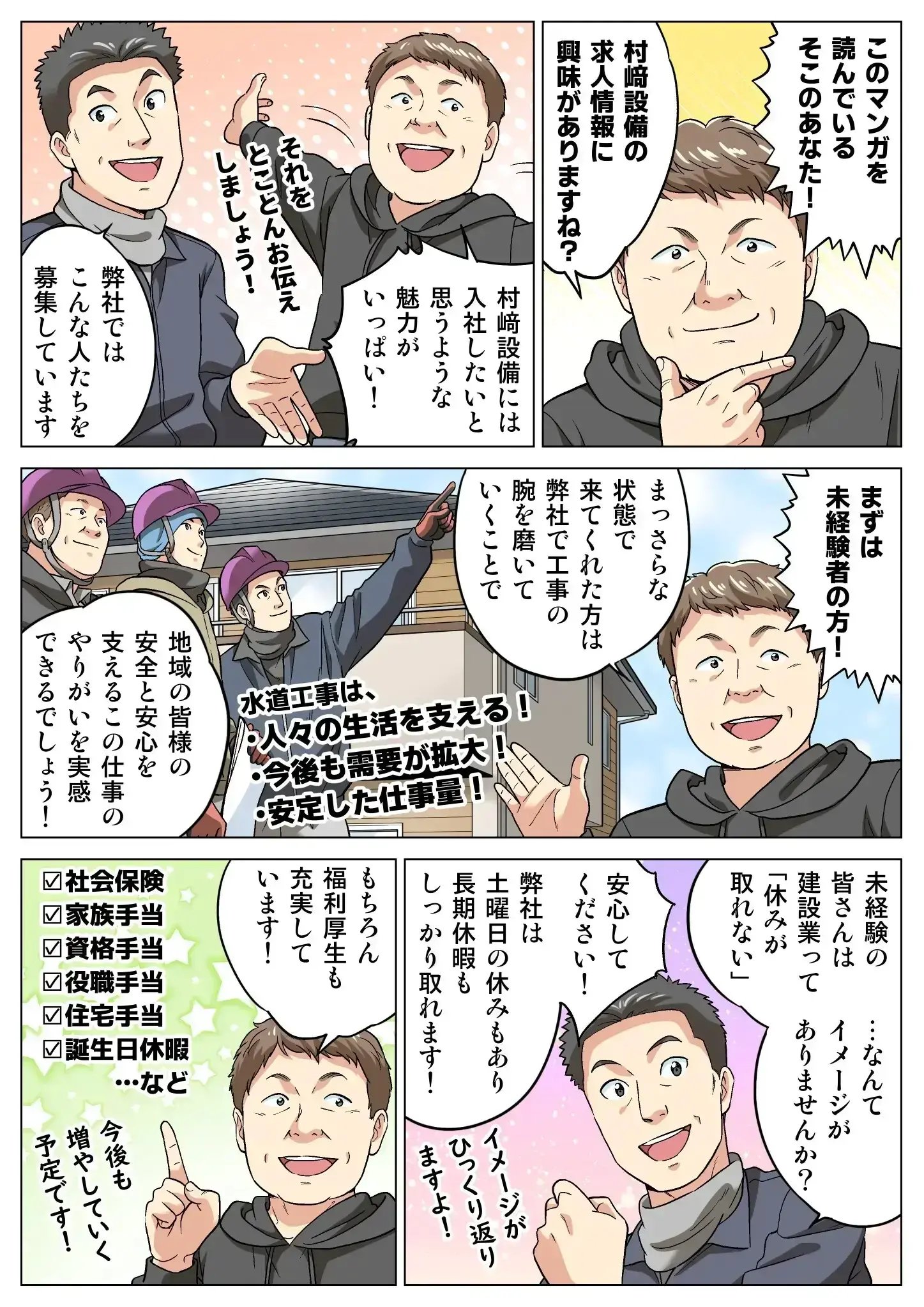 村﨑設備は在籍するスタッフ全員で会社を作っていきたいと考えています。スタッフが楽しめる制度を考えられるのは本人たちだけ。これからもたくさんの制度で会社を盛り上げていきたいと思っています。「こんなことが出来たら嬉しいな」といった要望があれば気軽に伝えられる職場です。ぜひ皆さんも入社してどんどん意見を出していってください!